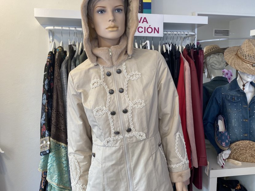 Chaqueta marron con adornos de hilo en beich y botones. Con capucha .Chicas, ideal para el frio y la lluvia. Facil de combinar. De la firma Akinolaude. Descubre las novedades de Carmen Navarrete