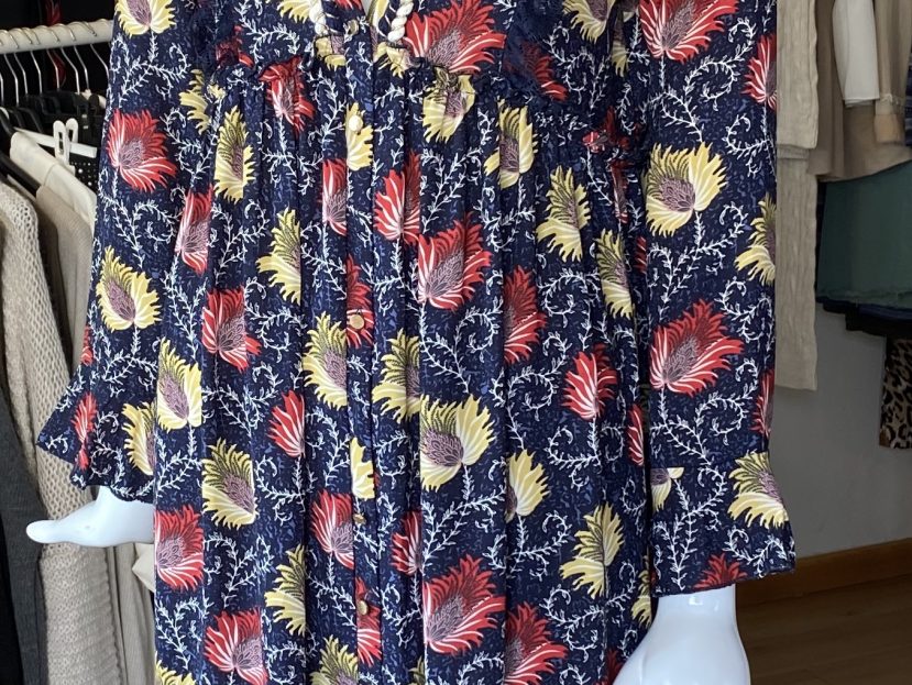 Vestido Akinolaude con motivos florales. Vestido largo abotonado delante, con encaje en azul marino. TALLA S